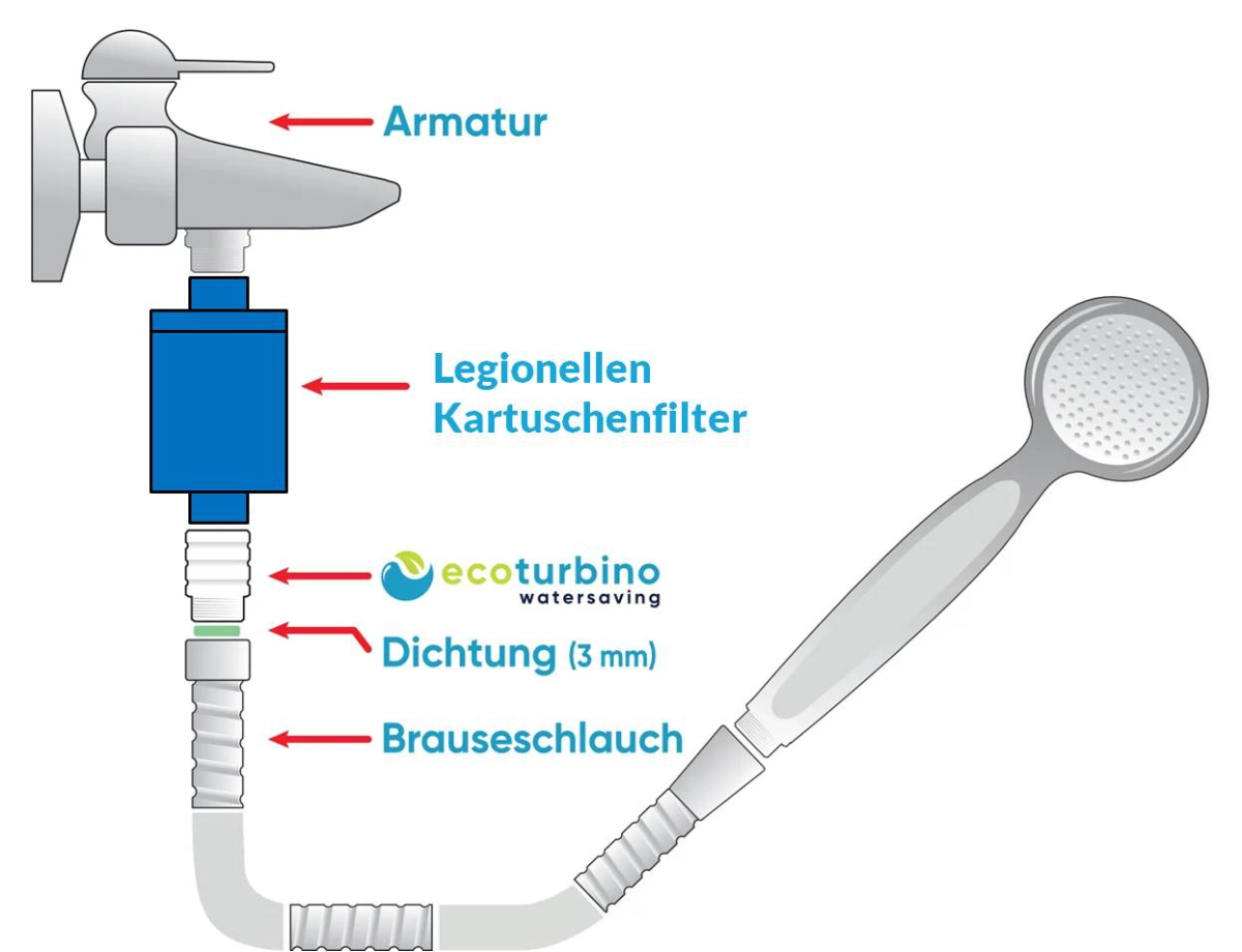 - The ecoturbino clinic+ system with legionella filter and replaceable cartridge makes shower systems in clinics and senior care facilities certified legionella-free. At the same time, the system saves up to 50% on water, energy, and wastewater costs without compromising shower comfort.