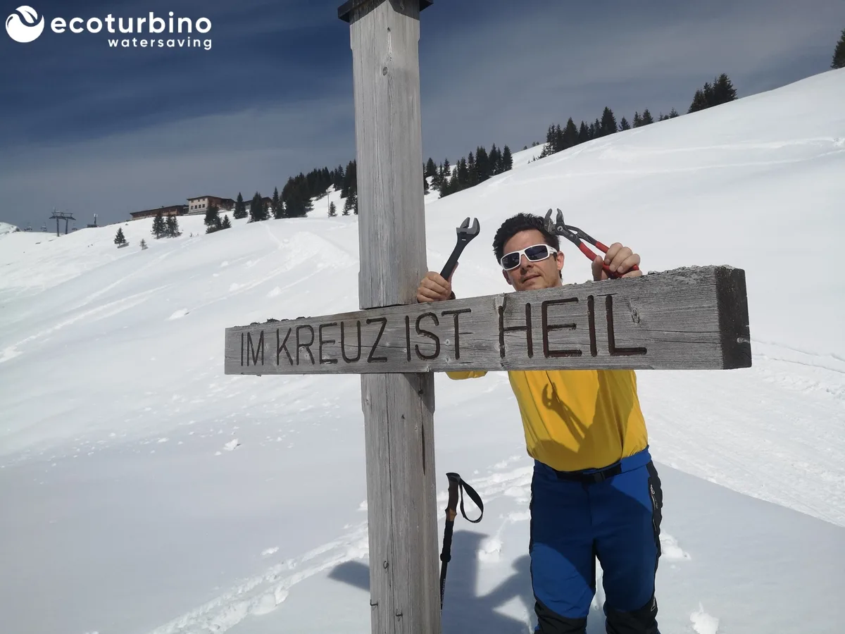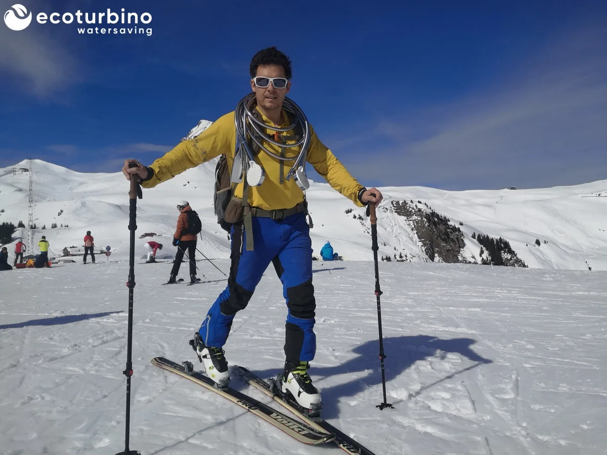 To counteract this problem, Marco spontaneously decided to order complete ecoturbino Deluxe Sets for the replacement of all showers in the Elsenalpstube hotel, along with some showerheads from Hans Grohe for the suites, to promote sustainable water usage in the hotel. As a thank you for this spontaneous decision, we offered to bring the ecoturbino sets up in our backpack during a ski touring trip and to install the first ones ourselves.